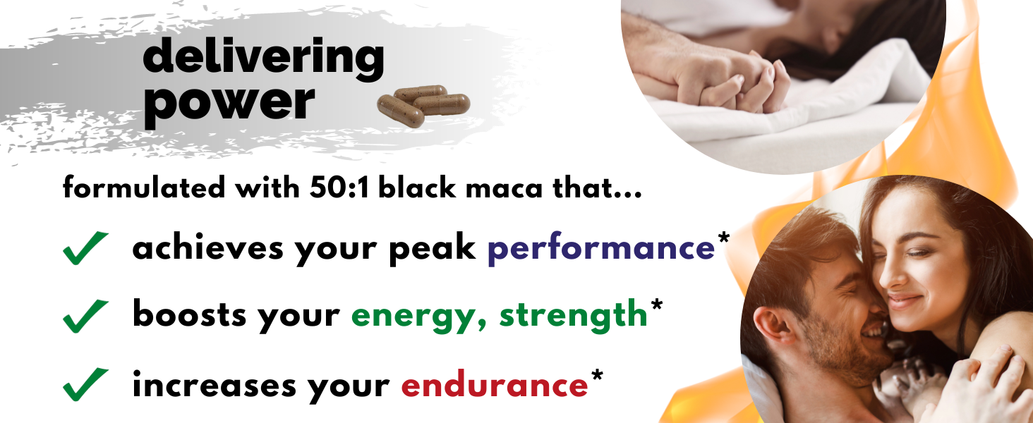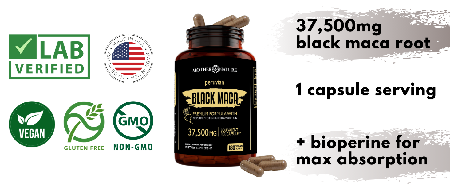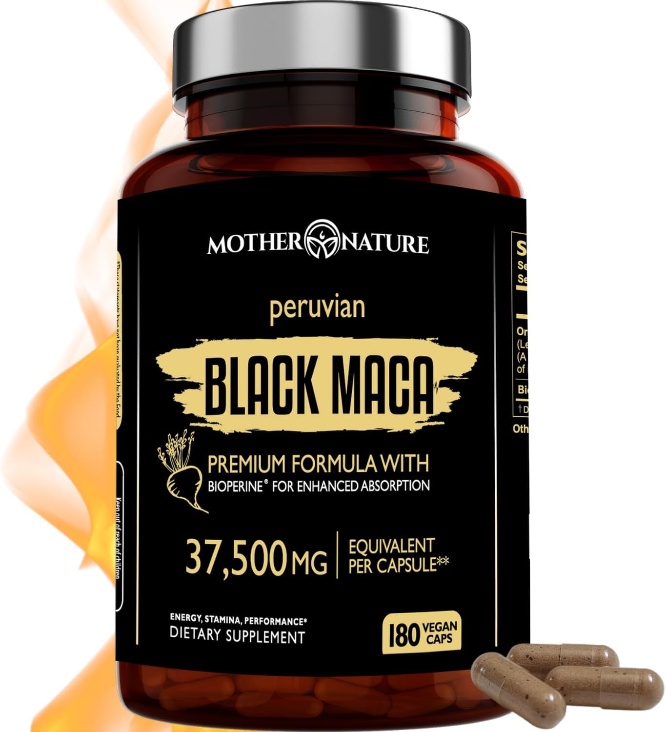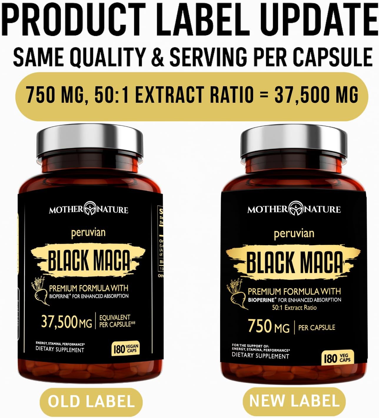 Organic highly concentrated Peruvian Black maca Root Capsules for Men, 100% pure maca Root 50:1 extract can enhance endurance, energy and muscle gain - 180ct