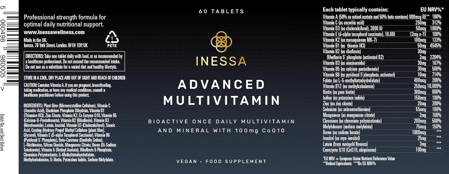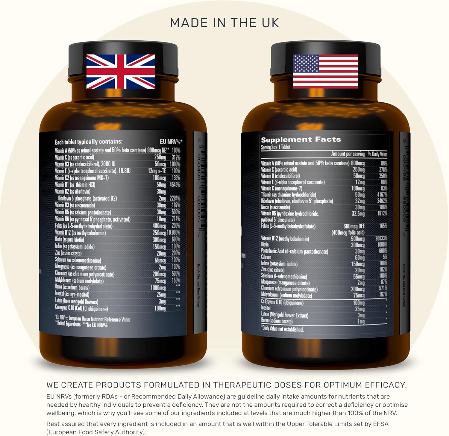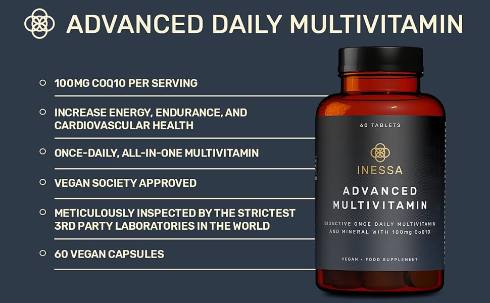 Premium Natural daily Men\'s multivitamin contains 100 mg of CoQ10, vitamin D3, K2, A and B multivitamins, folic acid and zinc-60 vegetarian tablets