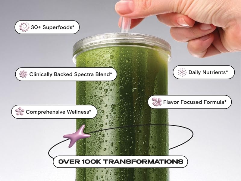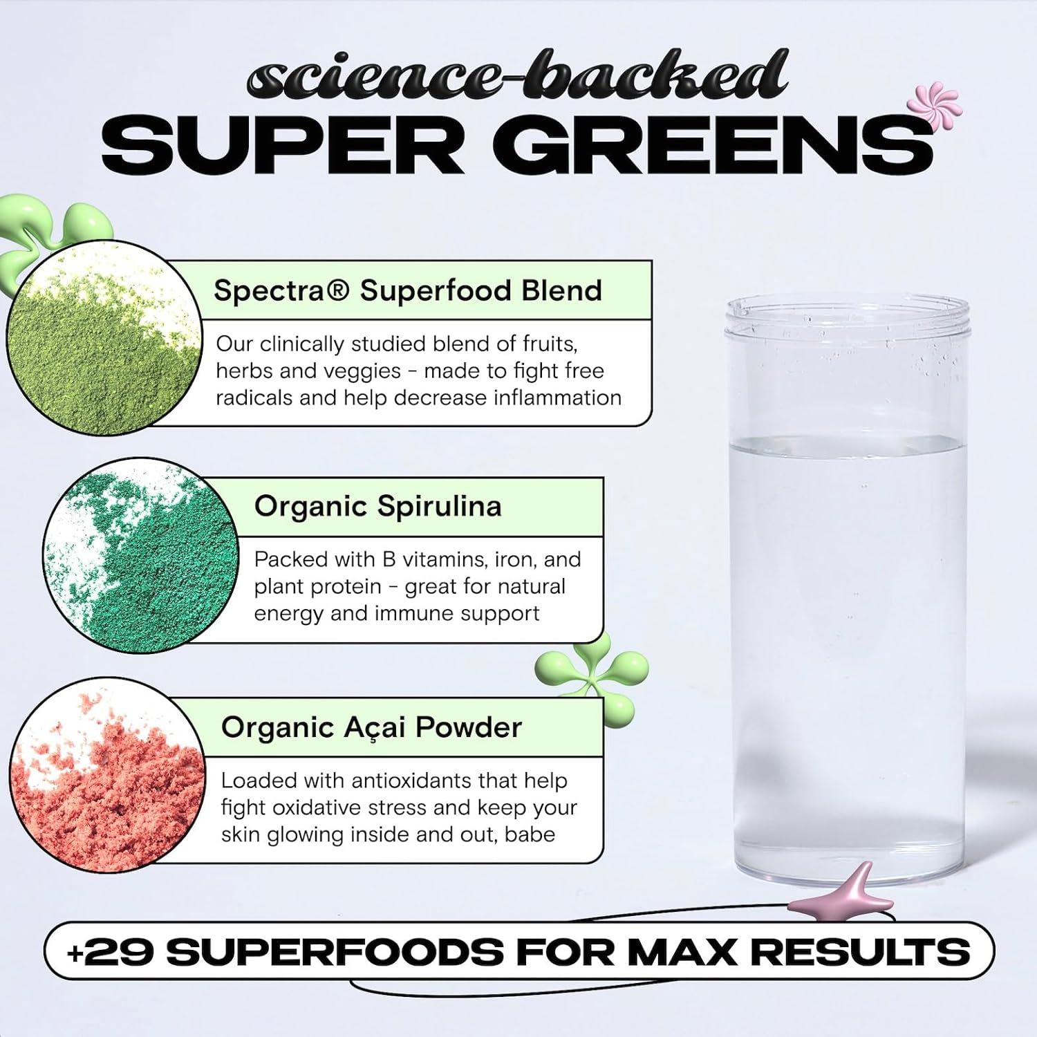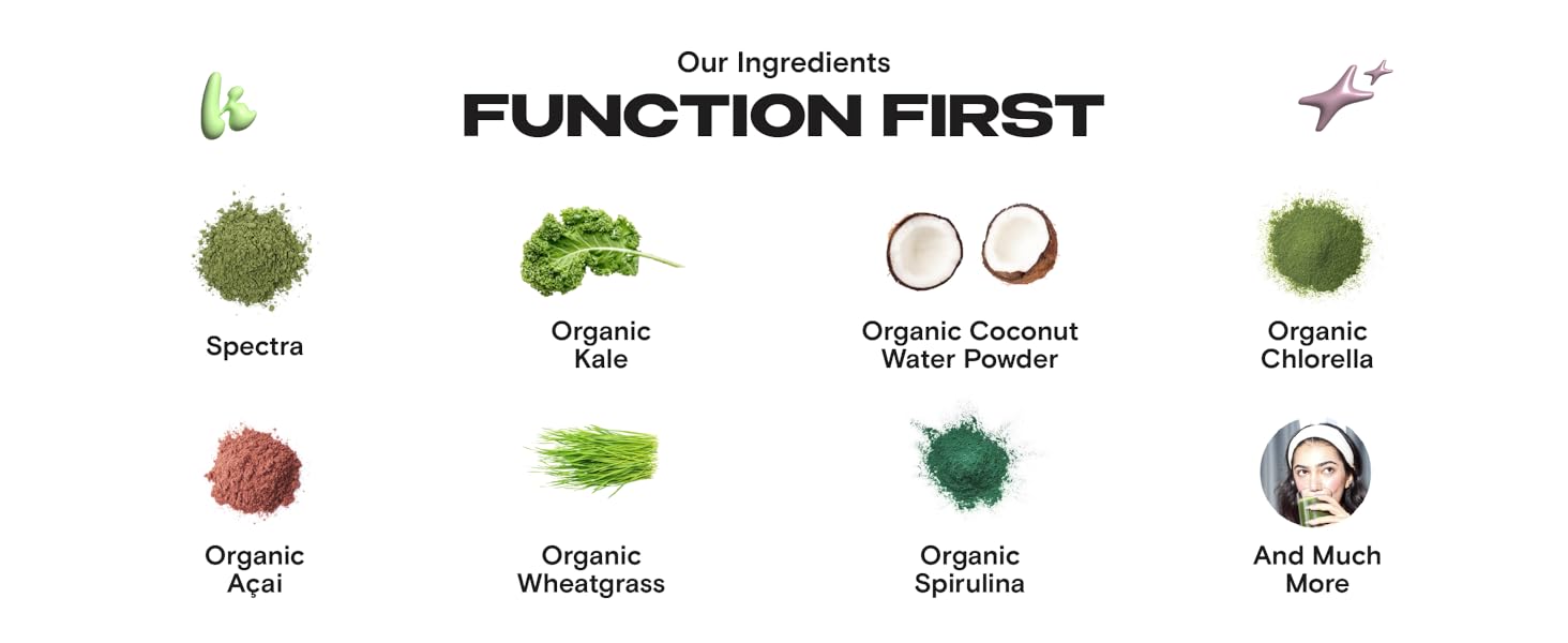 Organic green powder containing spirulina and chlorellum, used for digestion, intestinal health, immunity, energy, gluten-free, vegetarian and sugar-free