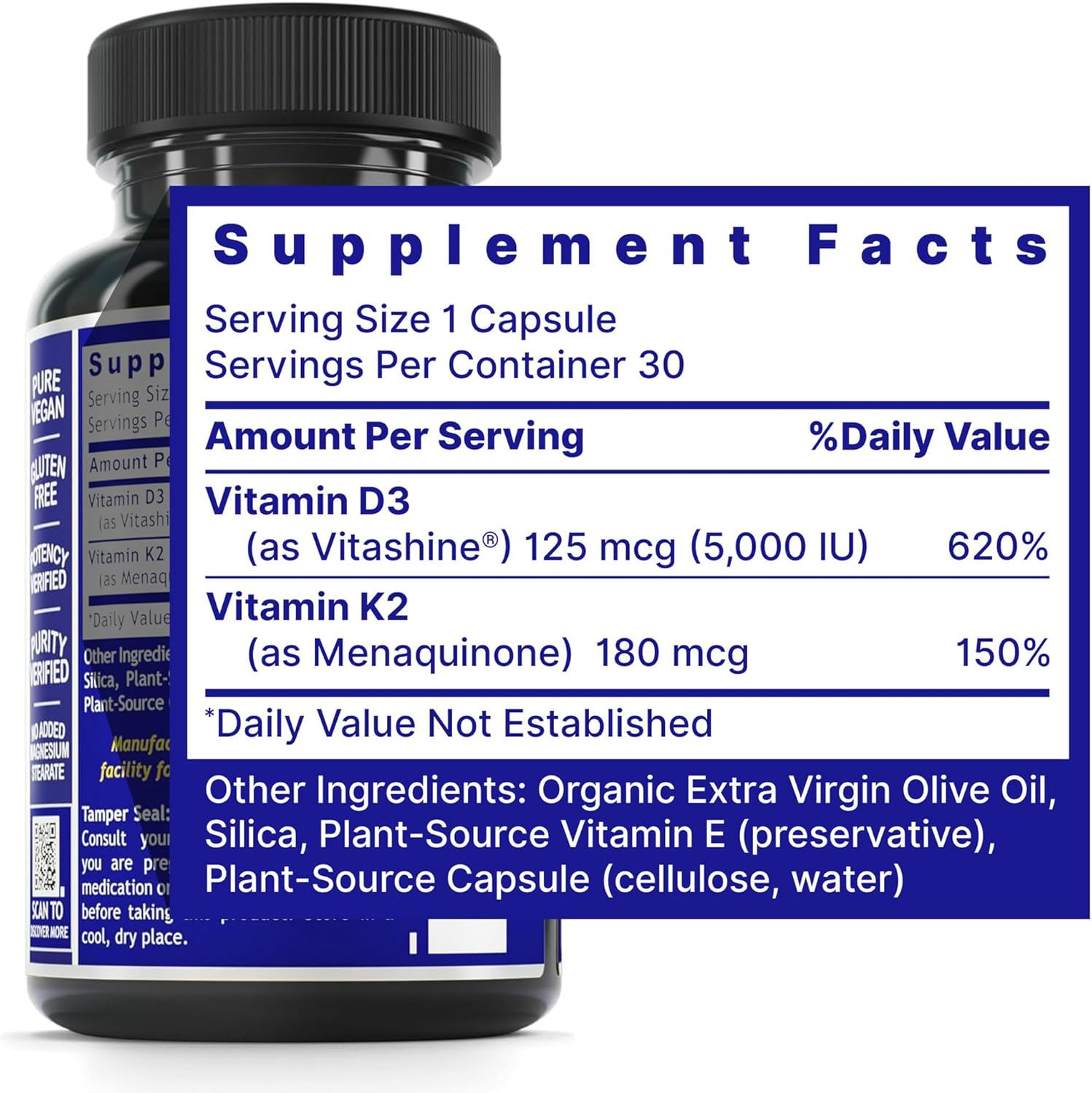 Quantum Nutrition Labs Vitamin D3 and K2 Supplements - Bone and Heart Health Support for Men and Women,5000 IU, Vegan vitamins