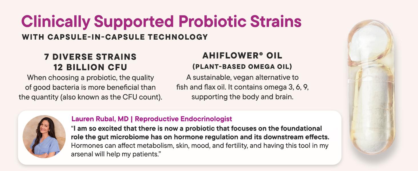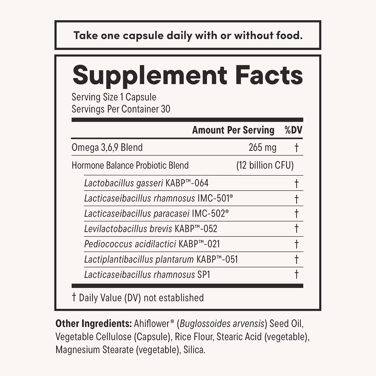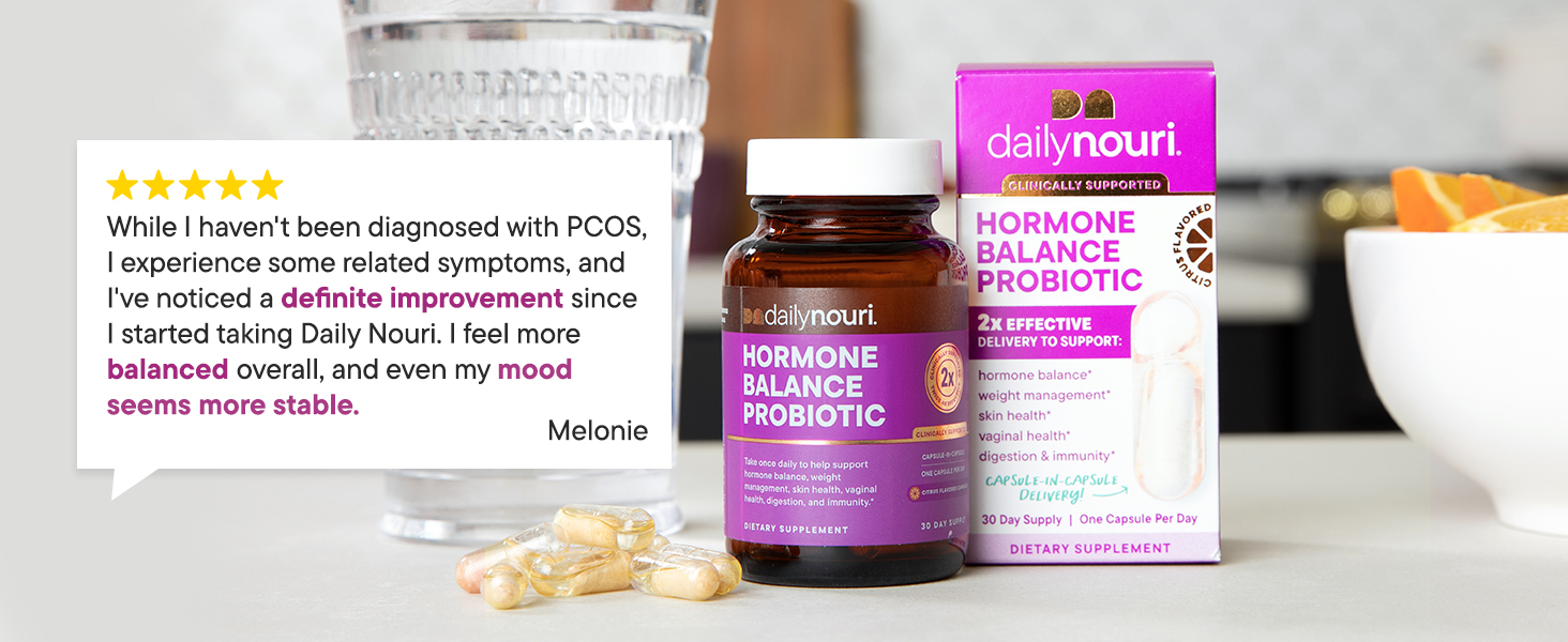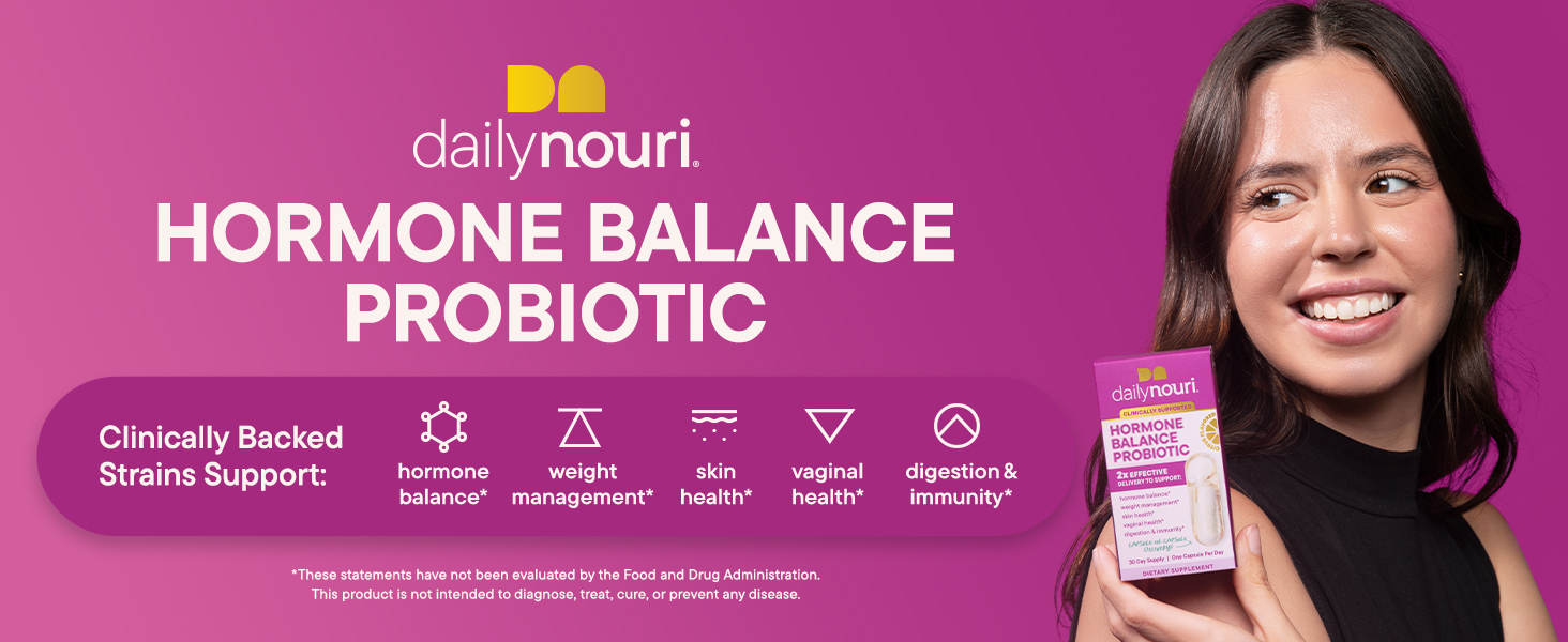 Nouri Hormone Balance Probiotics every day support healthy estrogen, PMS, PCOS, menopause, pH, yeast, intestinal health, skin and immunity