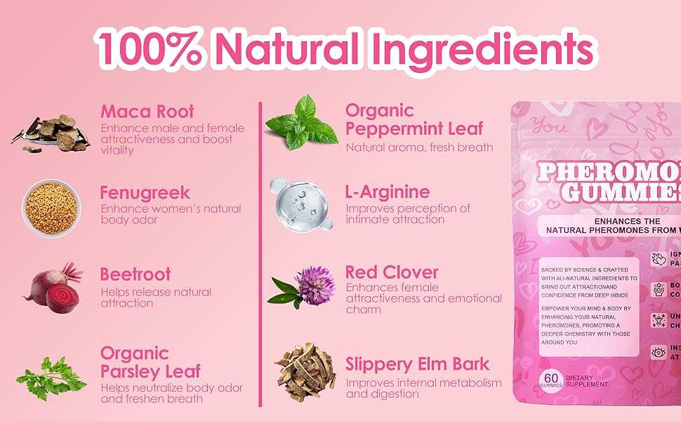 Female pheromone gummy candies contain maca, fenugreek, beetroot, parsley and L-arginine - shining from the inside out - 60 vegan gummy candies